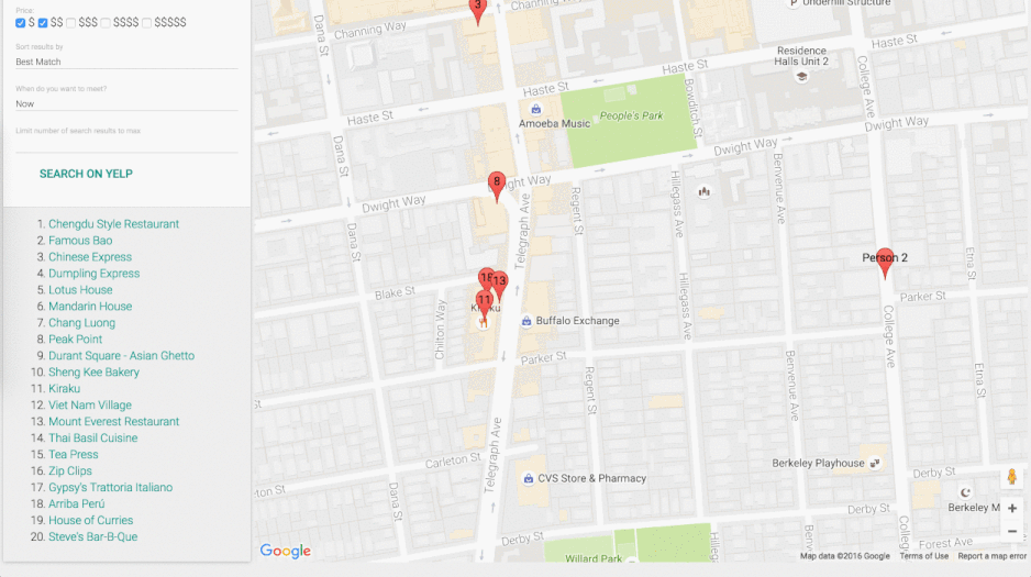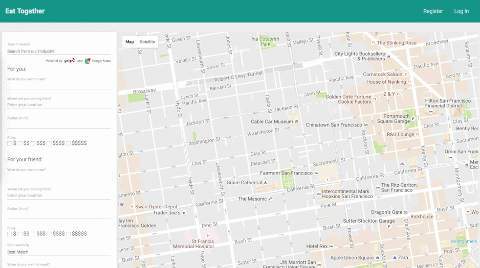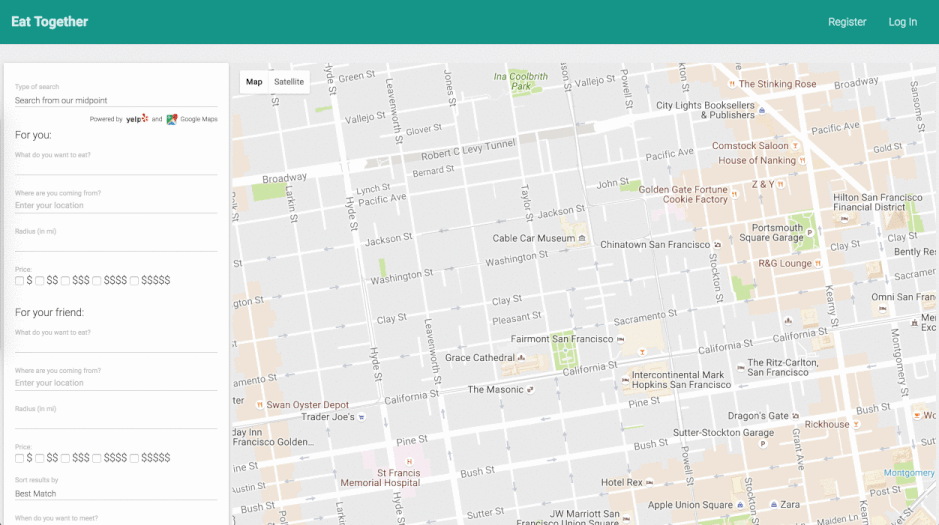 Eat Together helps two people decide on a place to to share a meal together. Each user can input their locations and the types of restaurants they’d like to visit and search on Yelp according to both sets of preferences. The search results are then shown on a map with markers that provide more information about each business in the search results. Users can create accounts and keep track of visits, and Eat Together will provide a recommendation on which restaurant is ‘similar’ to their most highly rated restaurant.